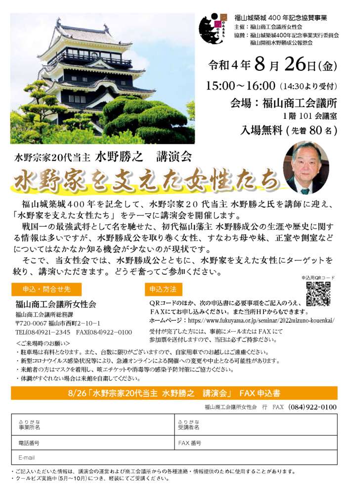福山城築城 400 年を記念して、水野宗家 20 代当主 水野勝之氏を講師に迎え、「水野家を支えた女性たち」をテーマに講演会を開催します。