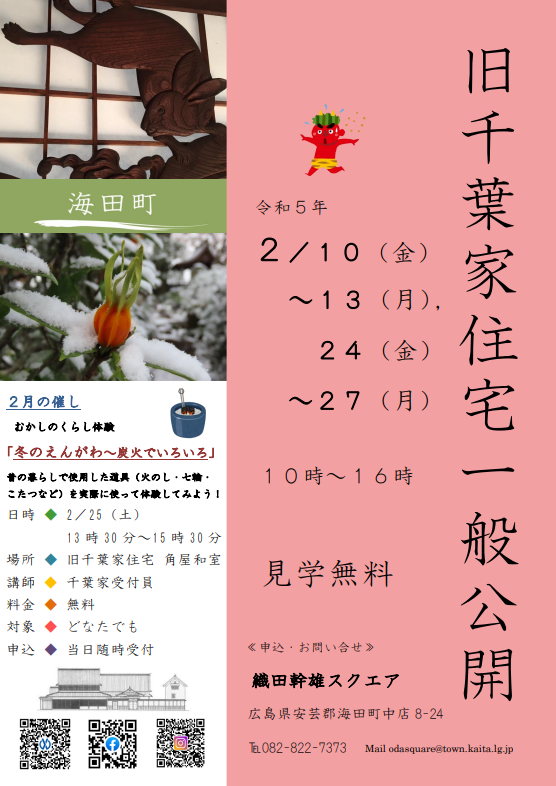 旧千葉家住宅は、西国街道の宿場町として栄えた海田にあって、宿駅の要職を勤めた千葉家の旧宅です。