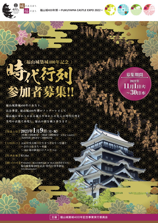 問い合わせ先 : 株式会社夢絆社中 福山城400年記念時代行列事務局 TEL:084-944-5517