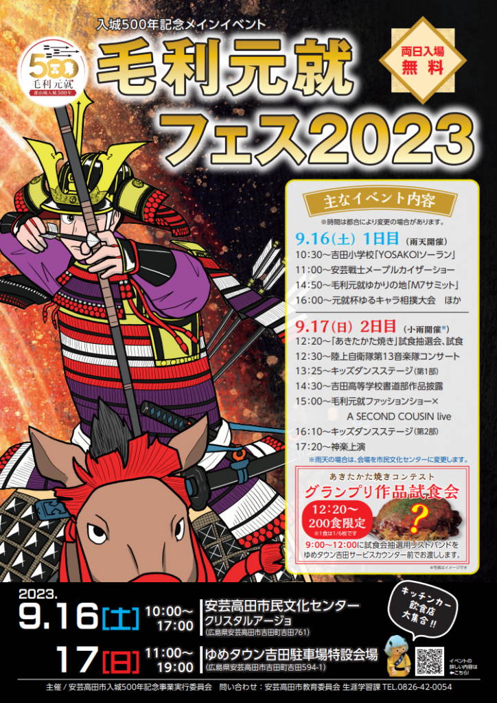 問い合わせ先 : 安芸高田市入城500年記念事業実行委員会(安芸高田市教育委員会生涯学習課内)0826-42-0054