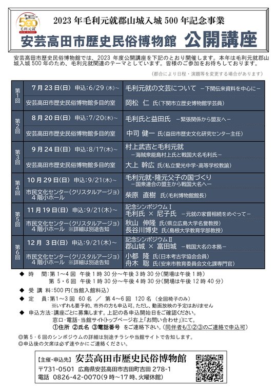 安芸高田市歴史民俗博物館では、2023 年度公開講座を下記のとおり開催します。